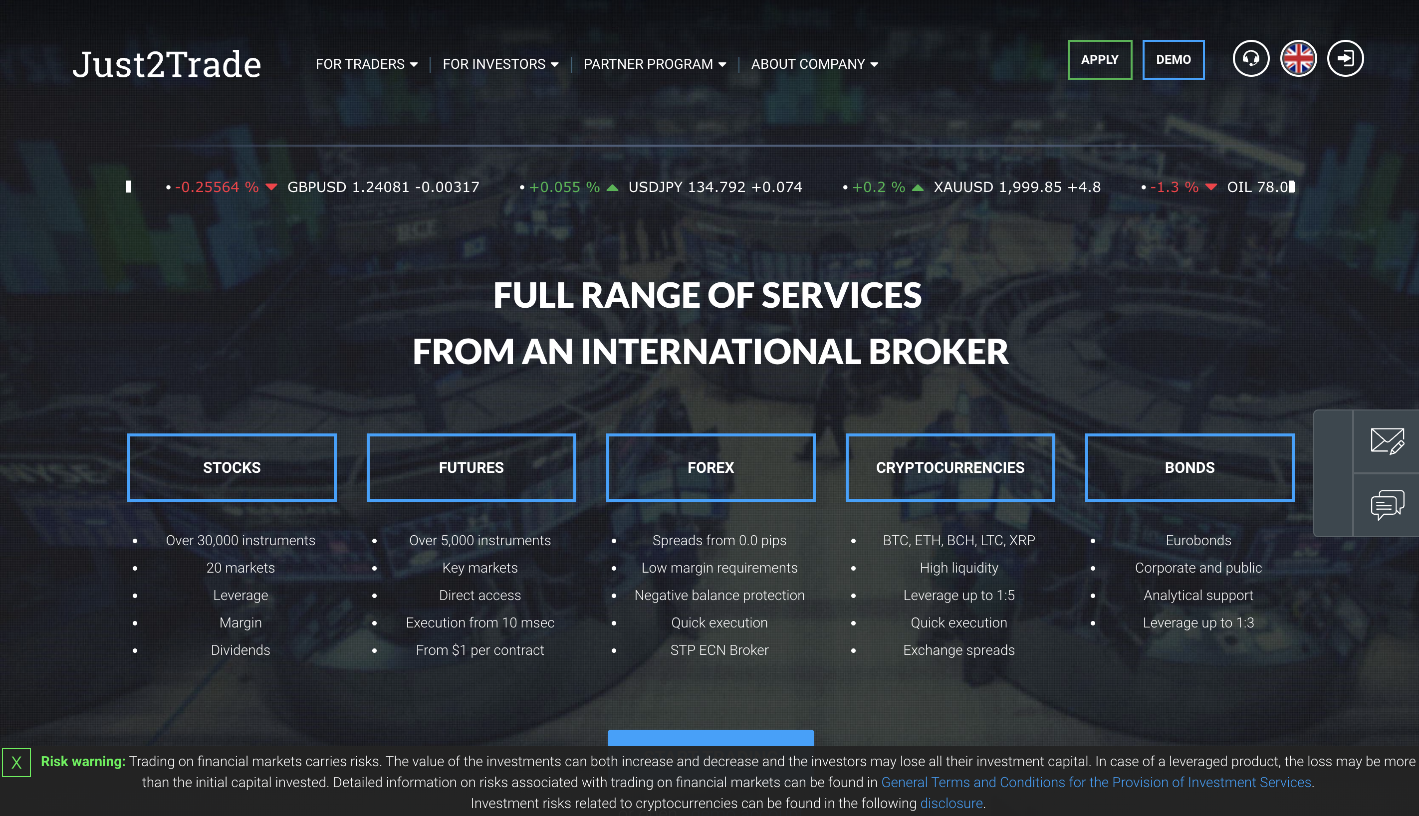 Just2Trade is a broker giving a full range of brokerage services to clients around the world. You can trade various trading assets with the very broker, including currencies, stocks, metals, indices, options shares, and energies. Just2Trade gives the opportunity to trade using a variety of trading instruments, as well different account types.